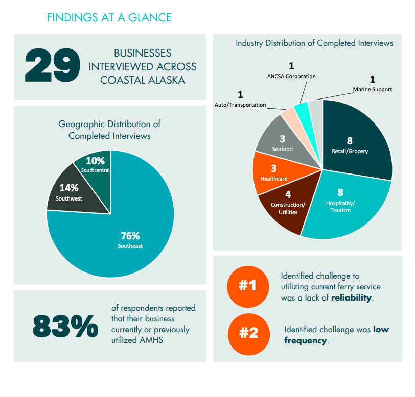 Residents and visitors in Southeast Alaska rely greatly on transportation services in order to navigate the unique terrain of the region. Businesses in Southeast view the greatest strengths of the transportation industry as the ability to connect communities, support the tourism sector, and provide barge services.