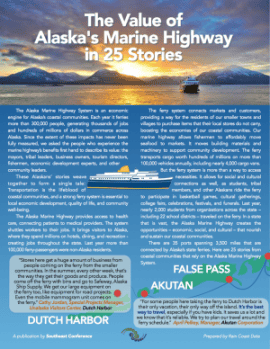 We asked the people who experience the marine highway’s benefits first hand to describe its value: the mayors, tribal leaders, business owners, tourism directors, fishermen, economic development experts, and other community leaders. These Alaskans’ stories weave together to form a single tale: Transportation is the lifeblood of coastal communities, and a strong ferry system is essential to local economic development, quality of life, and community well-being. There are 35 ports spanning 3,500 miles that are connected by Alaska’s state ferries. Here are 25 stories from coastal communities that rely on the Alaska Marine Highway System.