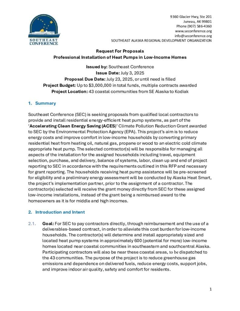 Southeast Conference (SEC) is seeking proposals from qualified local contractors to provide and install residential energy-efficient heat pump systems, as part of the ‘Accelerating Clean Energy Saving (ACES)’ Climate Pollution Reduction Grant awarded to SEC by the Environmental Protection Agency (EPA). This project’s aim is to reduce energy costs and improve comfort in low-income households by converting primary residential heat from heating oil, natural gas, propane or wood to an electric cold climate appropriate heat pump.